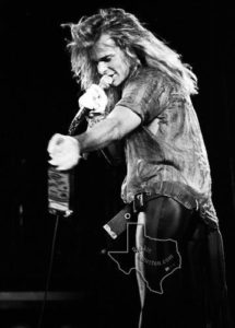 Well, the audience wasn’t exactly doing that because I could see the stage well enough for the entire show and I wasn’t that close to the stage. As I said, the venue was small. While the ushers didn’t stop the Mary, they did stop people from standing up on top of things or crawling onto the stage. I would have been a bit PO’d if they’d have been standing up on top of chairs or whatever it is they’re doing here. Though, some girl on the front row removed her bra and threw it onto the stage. Eddie hung it off the head of his guitar for at least one song before tossing it off to the side of the stage. Definitely one of the best shows. My brother went to see VH a bit later. I can’t recall if it was 1984 tour or one of the Hagar tours. I never saw another VH concert after this one. Once you’ve seen a concert this early in a band’s career, it’s really hard to top it. This is especially true because Eddie was at the top of his game right here using one of his original Frankenstrats.
